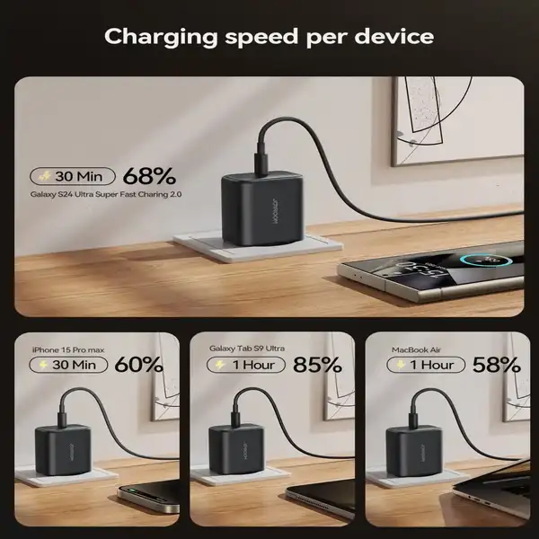 • توان 45 وات واقعی مناسب برای گوشی‌های پرچمدار و لپ‌تاپ‌های سبک مانند MacBook Air