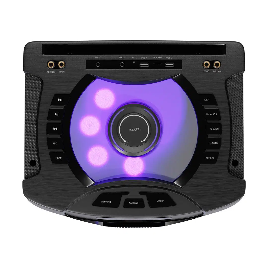| قابلیتهای اسپیکر | پخش موسیقی از طریق بلوتوث، USB، AUX و کارت حافظه TF؛ دریافت رادیو FM؛ قابلیت اتصال به تلویزیون و سایر دستگاهها از طریق Optical؛ دارای دو ورودی میکروفون و یک میکروفون بیسیم UHF؛ قابلیت TWS برای اتصال دو اسپیکر به صورت بیسیم؛ دارای 5 حالت نوری جذاب LED؛ قابلیت ضبط 3 جلوهی ویژه صوتی؛ ریموت کنترل برای کاربری آسان. |