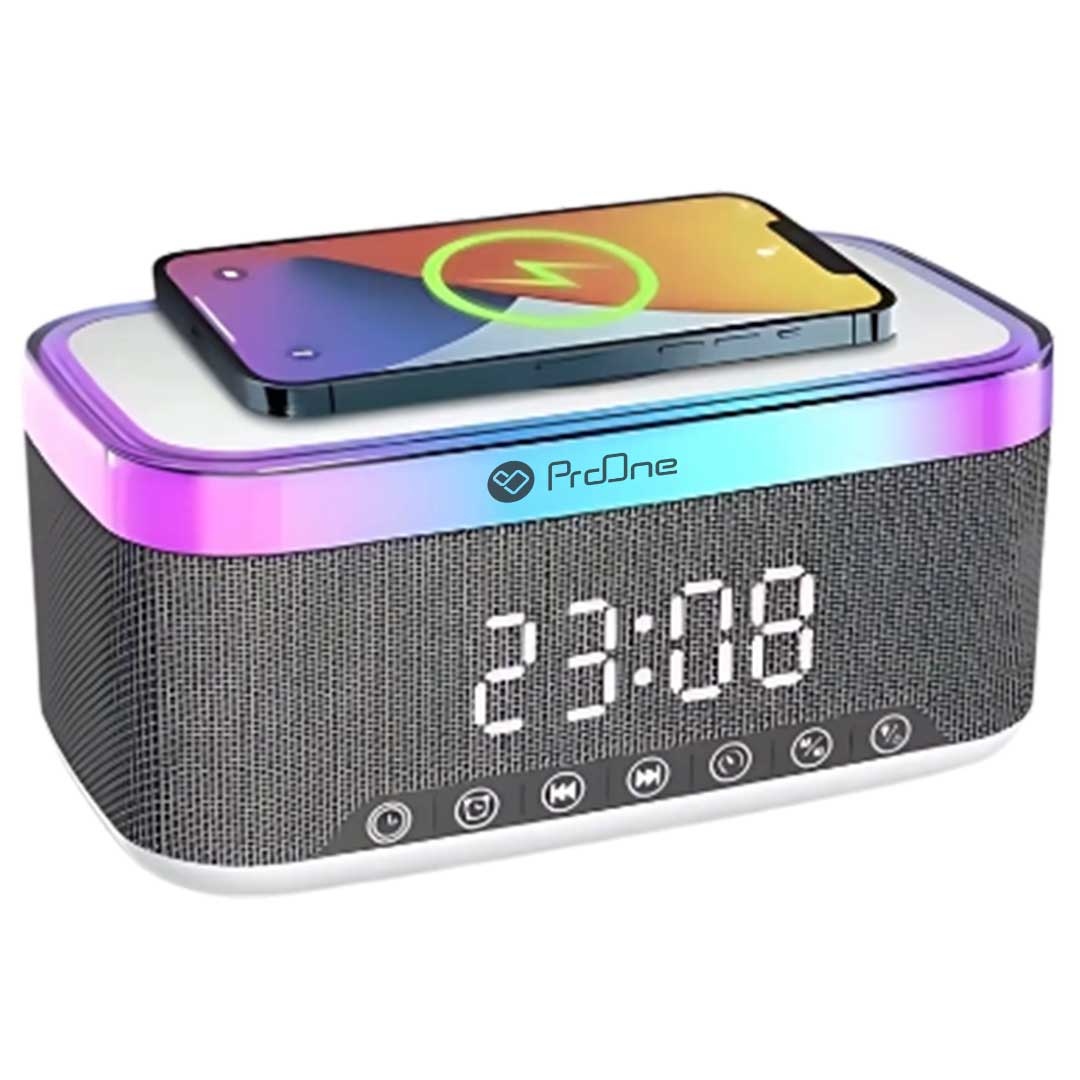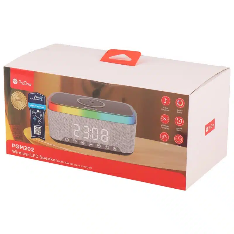 اسپیکر رومیزی بلوتوثی ProOne PGM202 یک دستگاه چندکاره است که علاوه بر پخش موسیقی، امکاناتی مانند شارژ بیسیم، نورپردازی RGB، نمایش ساعت دیجیتال و آلارم را در اختیار شما قرار میدهد. طراحی مدرن و بدنه مقاوم آن باعث شده تا این محصول هم برای استفاده در خانه و هم محیط کار گزینهای ایدهآل باشد.