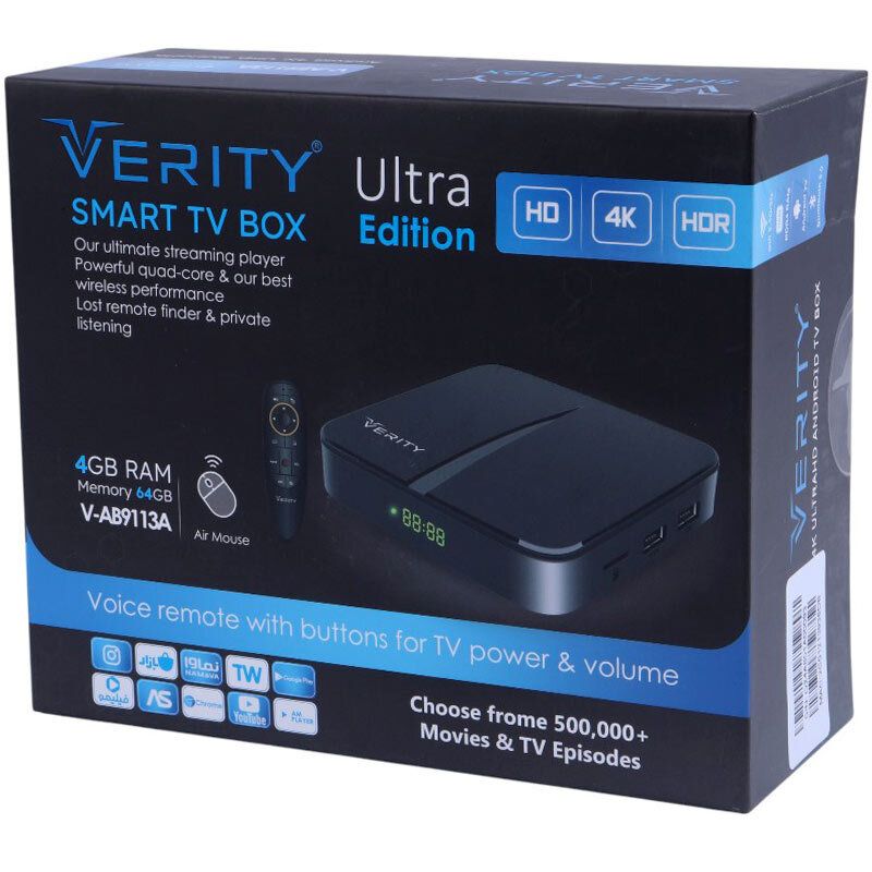 اندروید باکس Verity V-AB9113A با حافظه بالا، پشتیبانی از 4K، سیستمعامل اندروید 12 و ایر ماوس هوشمند، انتخابی عالی برای کسانی است که به دنبال ارتقاء تلویزیون خود به یک مرکز سرگرمی هوشمند، روان و قابل شخصیسازی هستند.