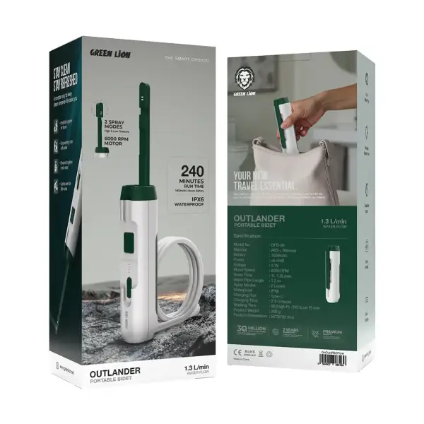 خود شور قابل حمل Green Lion Outlander Portable Bidet با باتری قدرتمند، طراحی ضدآب، دو حالت اسپری و قابلیت حمل آسان، انتخابی هوشمندانه برای کسانی است که به دنبال بهداشت شخصی مطمئن، راحتی و آزادی عمل در هر مکان هستند.