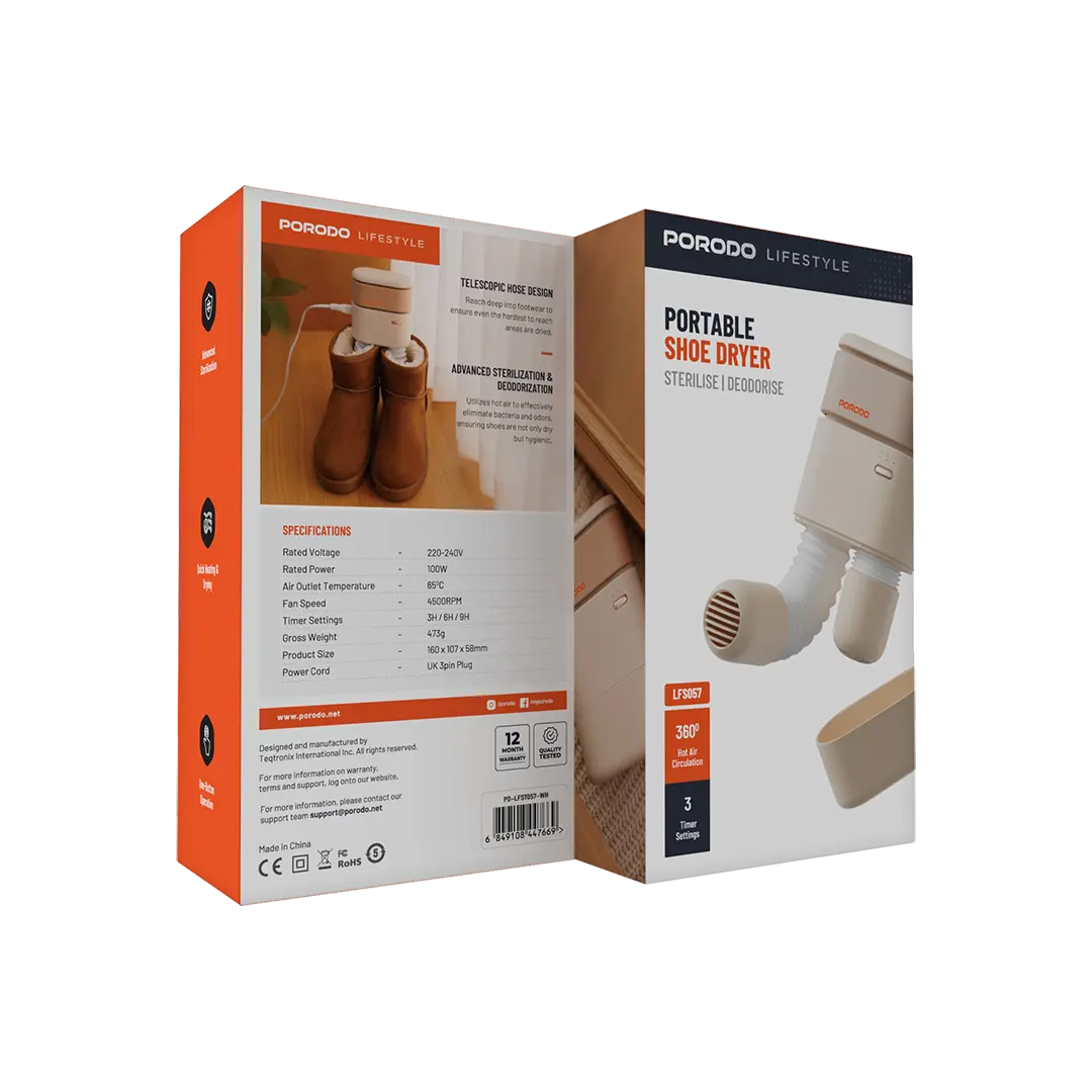 با خشک‌کن کفش پرتابل پرودو (Porodo Lifestyle Portable Shoe Dryer) کفش‌های شما همیشه خشک، تمیز و بدون بوی نامطبوع باقی می‌مانند. این دستگاه با توان 100 وات و طراحی جمع‌وجور، راهکاری حرفه‌ای برای حذف رطوبت و باکتری از داخل کفش‌هاست.