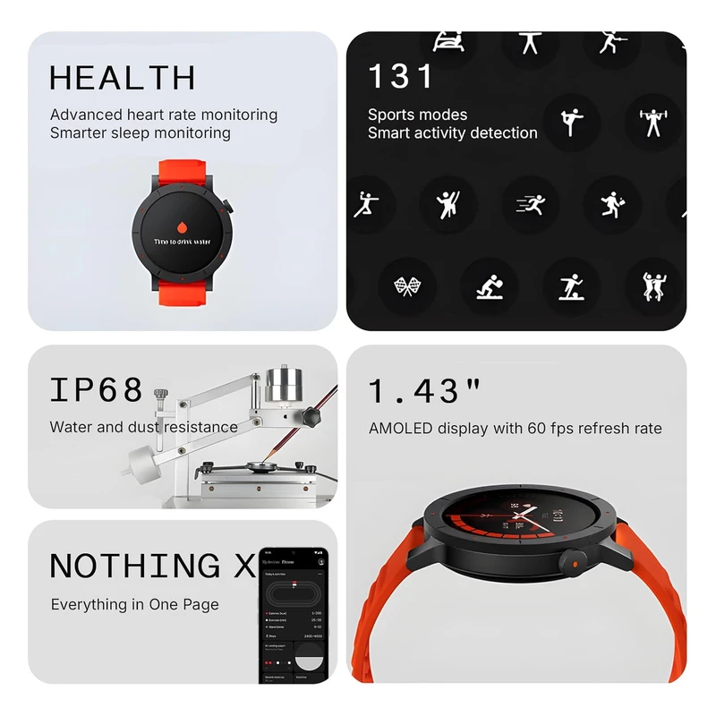 - نمایشگر: 1.43 اینچی AMOLED با وضوح 466×466 پیکسل و روشنایی 670 نیت