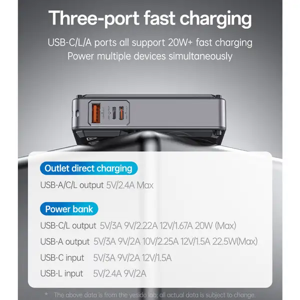 - خروجیها: USB‑A + USB‑C + کابل داخلی iP (Lightning)
