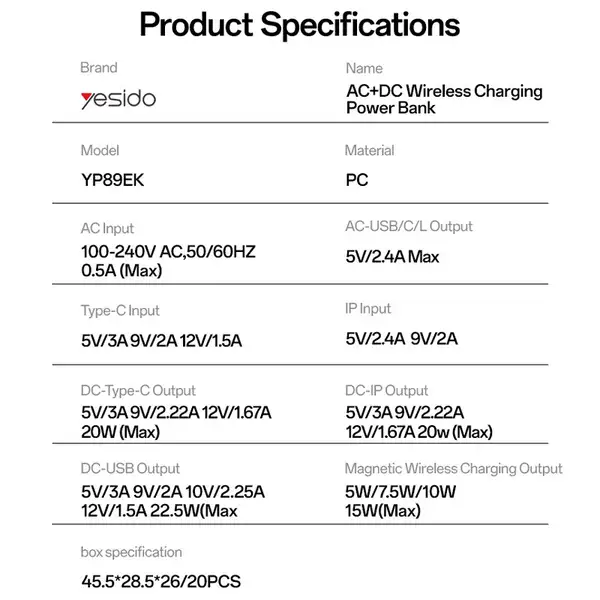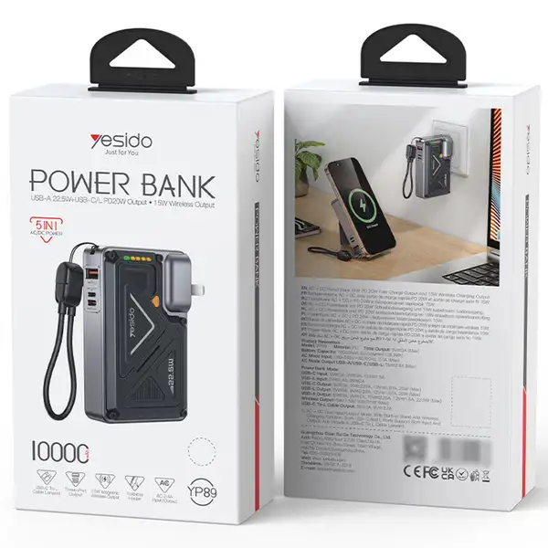 Yesido YP89 PD یک شارژر دیواری و پاوربانک بیسیم ترکیبی با ظرفیت 10000mAh و توان 22.5 وات است که با پشتیبانی از شارژ سریع، شارژ بیسیم 15 وات و چندین خروجی، انتخابی هوشمندانه برای کاربرانی است که به دنبال یک دستگاه چندمنظوره، سبک و قابل اعتماد هستند. این محصول با طراحی مدرن و ایمنی بالا، گزینهای ایدهآل برای استفاده روزمره و سفر محسوب میشود.