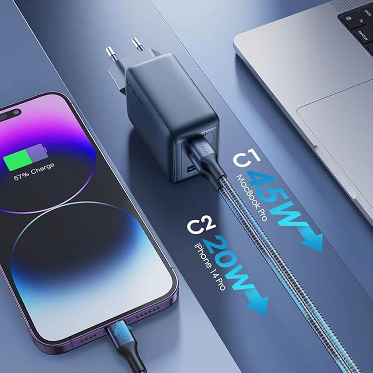 - ترکیب خروجیها: USB-C1+C2: 45W+20W / USB-C1+USB-A: 45W+18W / USB-C1+C2+USB-A: 45W+15W