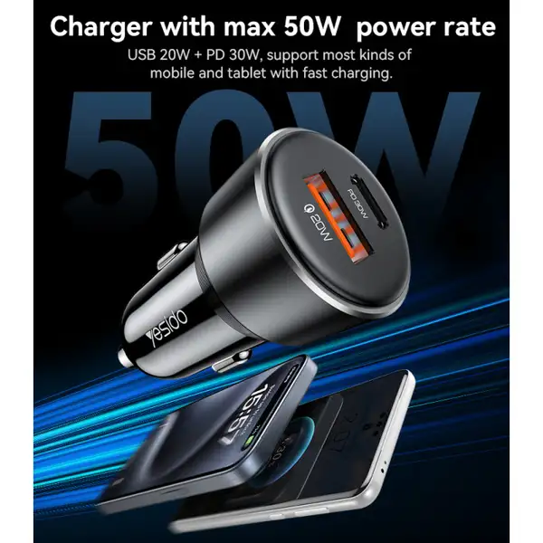 شارژر فندکی یسیدو 50 وات مدل Yesido Y64 Aluminum Alloy Super Fast Charging QC + PD Dual Ports