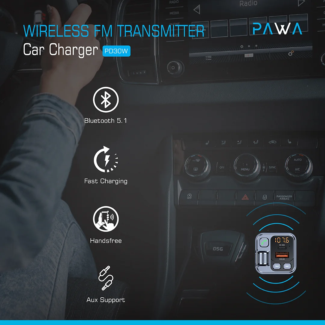 PW-FM16PD30 یک فرستنده FM بیسیم (Wireless FM Transmitter) نیز هست که به شما اجازه میدهد فایلهای صوتی را از طریق بلوتوث نسخه 5.1 (Bluetooth 5.1) یا کارت حافظه USB (با پشتیبانی تا 64 گیگابایت) به سیستم صوتی خودرو منتقل کنید. فرکانس قابل تنظیم FM آن بین 87.5 تا 108.0 مگاهرتز (MHz) است و فاصله انتقال FM آن کمتر از 2 متر است. همچنین از Aux Support (پشتیبانی از ورودی AUX) نیز بهره میبرد تا بتوانید دستگاههای صوتی را به صورت باسیم نیز متصل کنید. وجود یک نشانگر LED (LED indicator) نیز وضعیت دستگاه را نمایش میدهد.