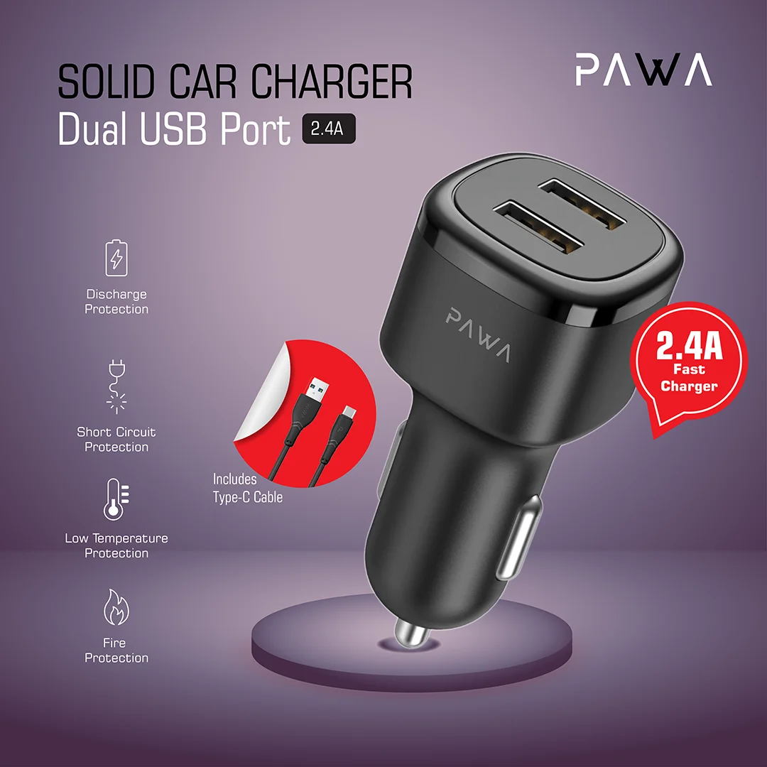 شارژر فندکی SOLID CAR CHARGER Dual USB Port 2.4A with Type-C Cable از برند پاوا Pawa