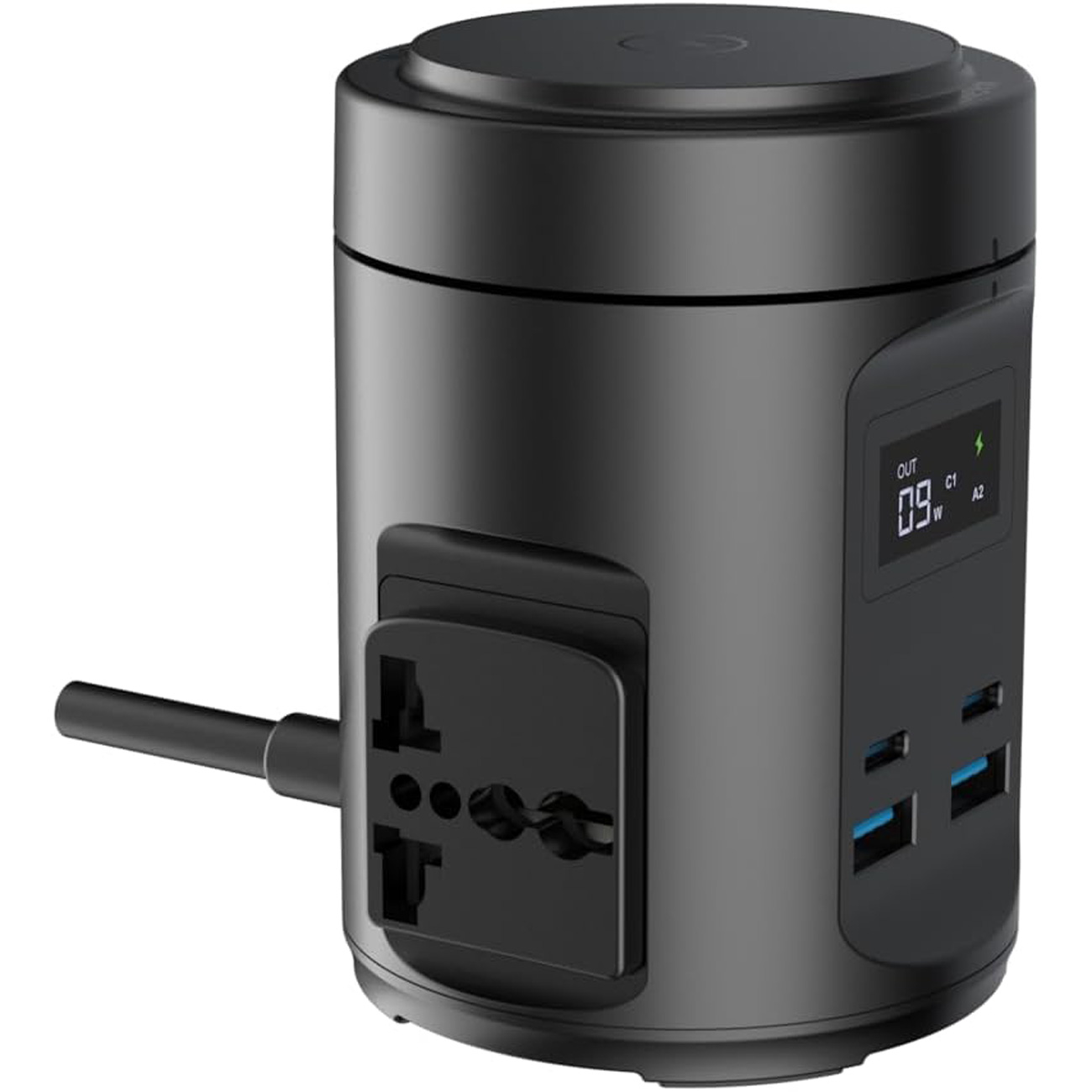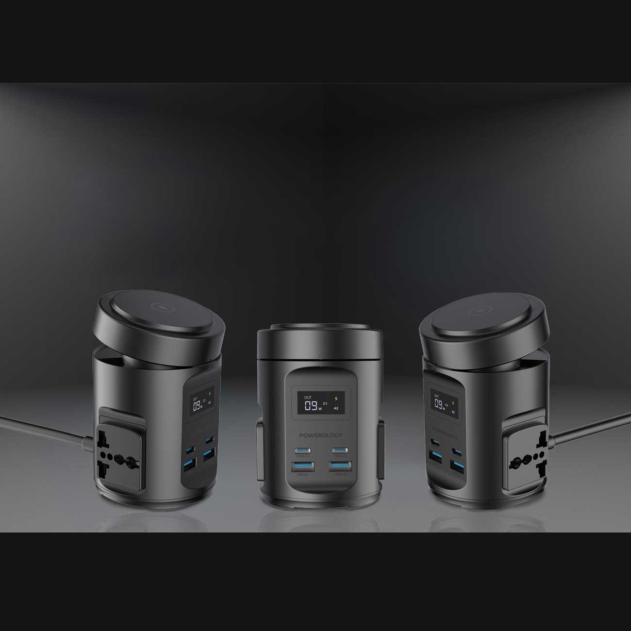 Powerology PWCUQC014 یک هاب شارژ حرفهای و چندراهی برق با طراحی رومیزی برجمانند است که شامل شارژر وایرلس ۱۵ وات، دو خروجی برق AC، چهار پورت USB (دو USB-A و دو USB-C)، و سیستم محافظ داخلیه. این مدل با پشتیبانی از فناوریهای PD 3.0 و QC 3.0، امکان شارژ سریع و ایمن انواع دستگاهها رو فراهم میکنه.