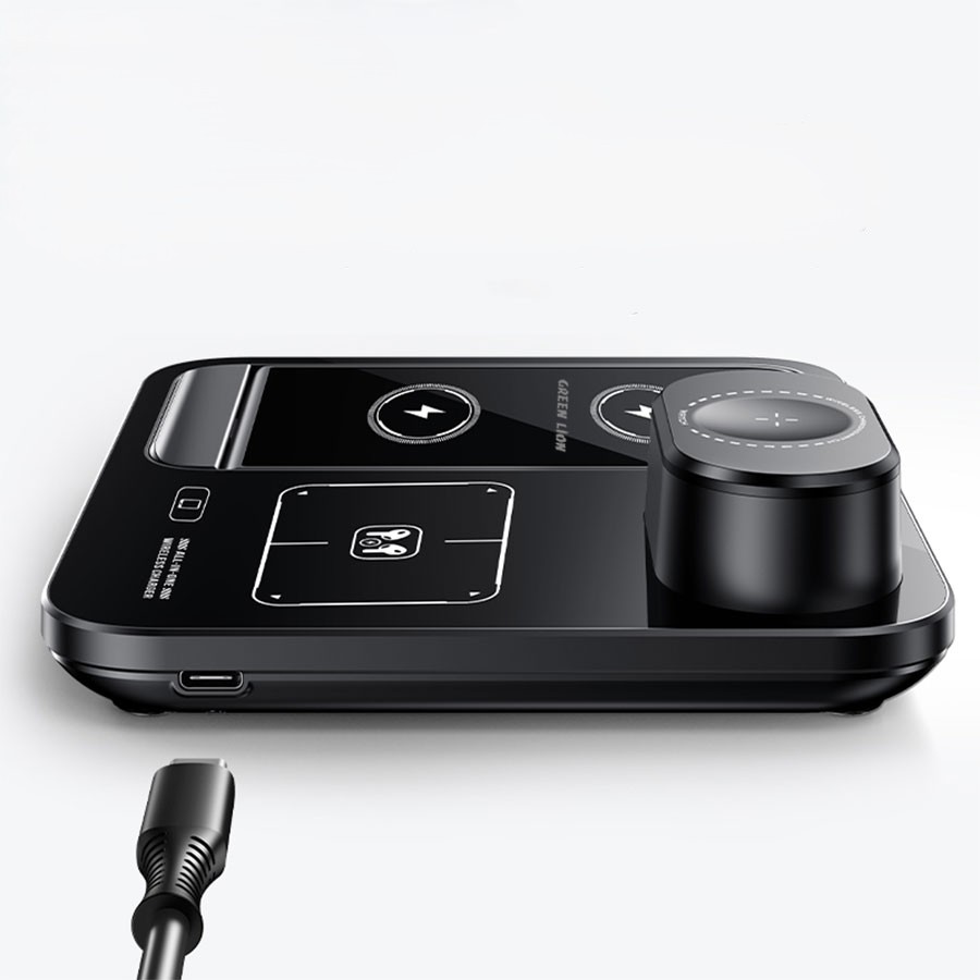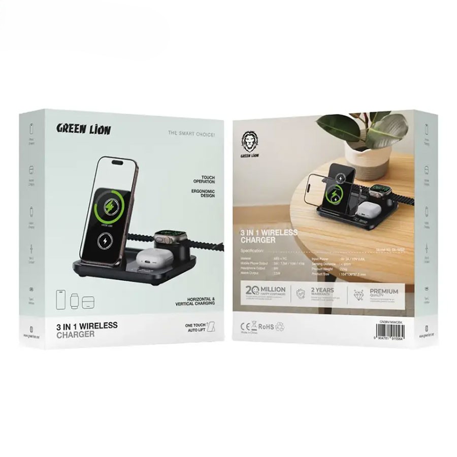 شارژر وایرلس سهکاره گرین لاین مدل Green Lion 3 in 1 Multifunctional Wireless Charger GN3IN1MWCBK