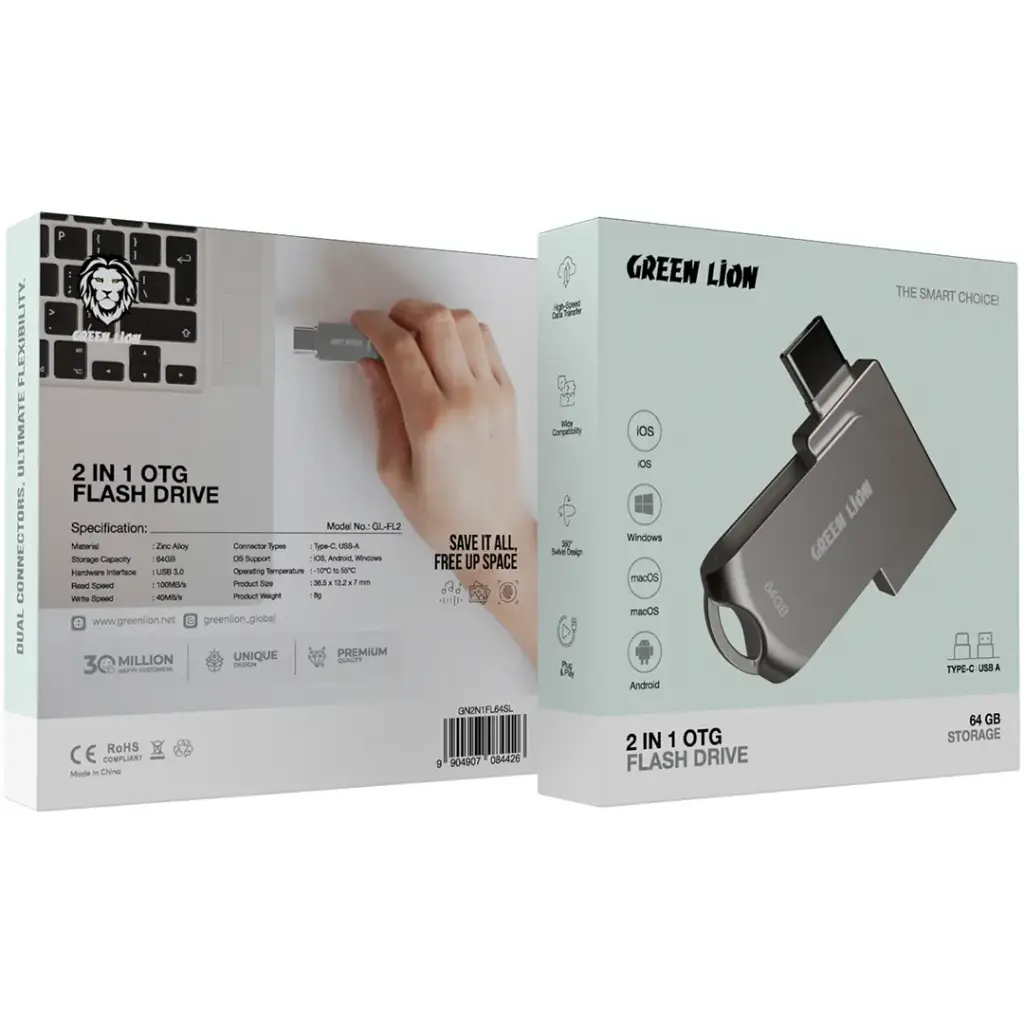 فلش مموری 64 گیگابایت گرینلاین مدل Green Lion 2 in 1 OTG USB‑C Flash Drive USB GN2N1FL64SL