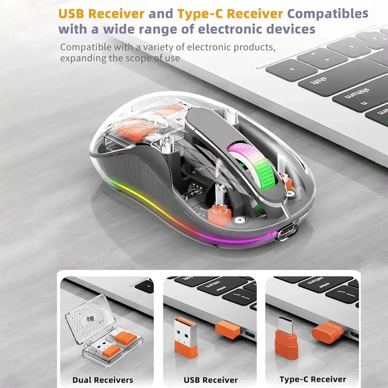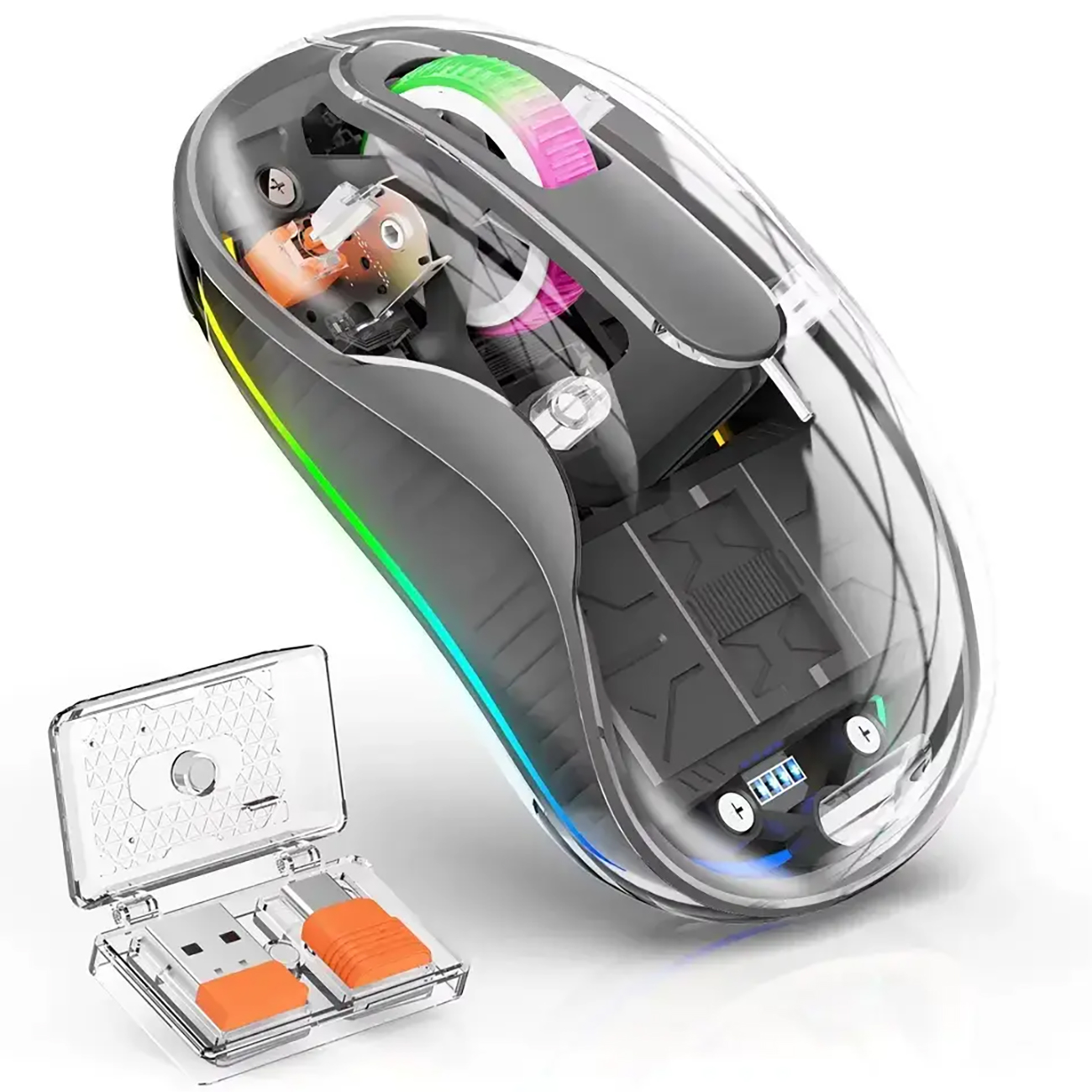 | ویژگیهای اضافی | بدنه شفاف با نورپردازی RGB، کلیک بیصدا، باتری داخلی ۴۰۰ میلیآمپر ساعتی، دو گیرنده USB-A و Type-C |