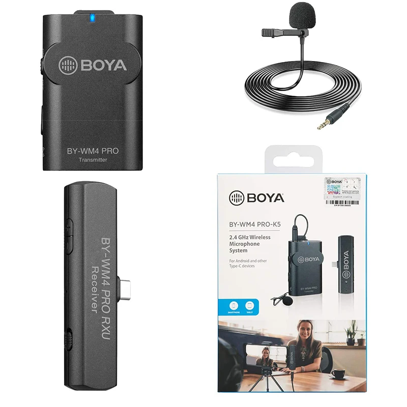 میکروفون یقه ای بویا مدل BY-WM4 Pro-K5 مجموعه دو عددی، یک سیستم حرفه ای میکروفون بیسیم ۲.۴ گیگاهرتزی است که مخصوص تولید محتوا، مصاحبه، و ضبط صدای با کیفیت طراحی شده است. این مجموعه شامل دو فرستنده (میکروفون یقه ای) و یک گیرنده است.
