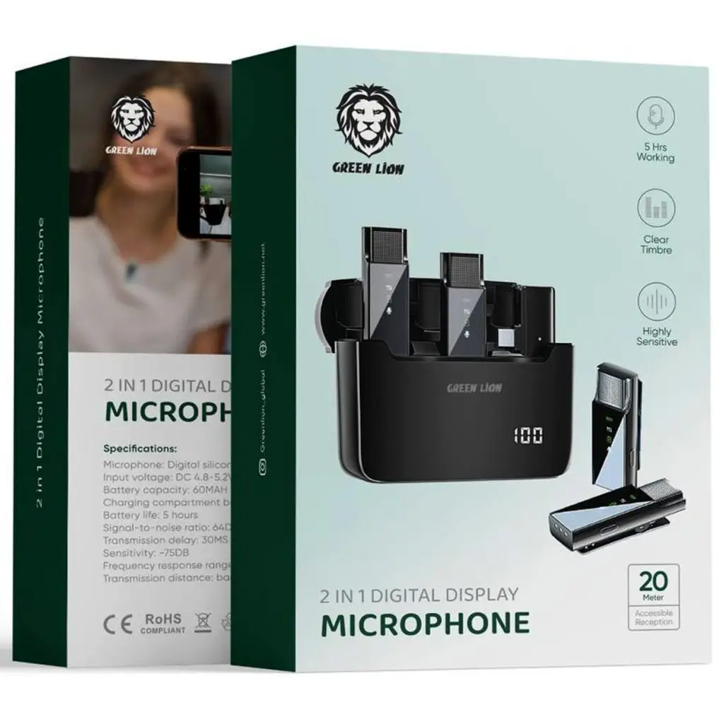 میکروفون یقهای Green Lion 2 in 1 Digital (Type-C) با کانکتور USB-C دیجیتال، نمایشگر LCD و فناوری حذف نویز محیطی (ENC)، راهکاری حرفهای و بینیاز از درایور برای ضبط صدای شفاف روی موبایل، تبلت و لپتاپهای دارای پورت Type-C است.