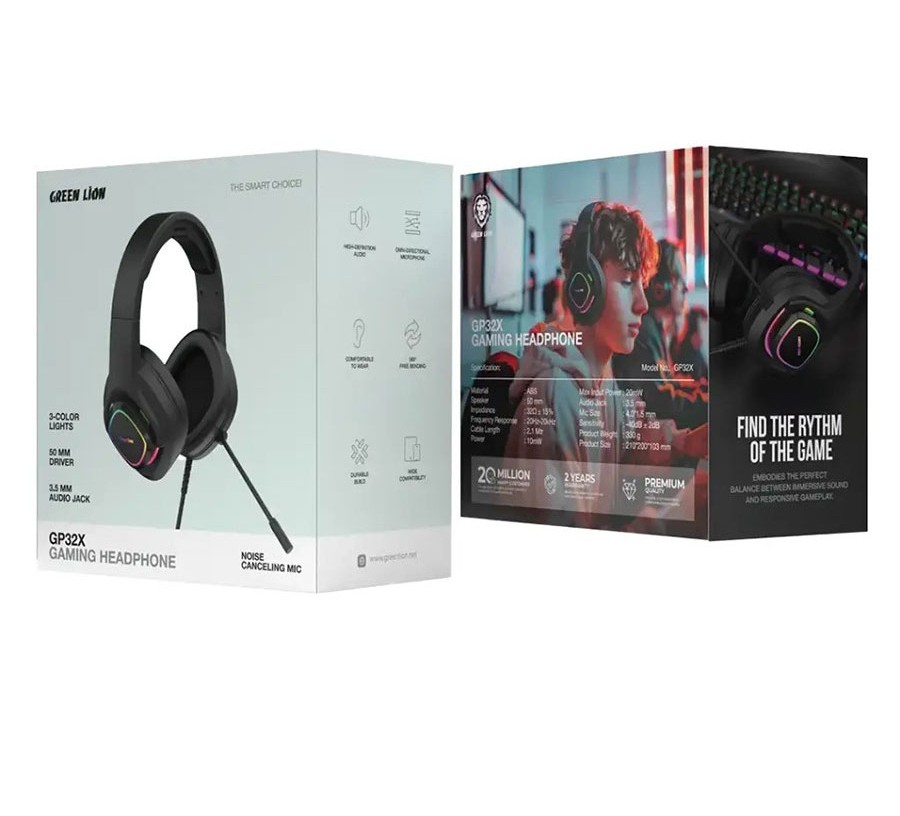 هدفون گیمینگ گرین لاین مدل Green Lion GP32X Gaming یک هدست سیمی دورگوشی حرفهای با درایور دینامیک 50 میلیمتری، نورپردازی RGB و میکروفون حذف نویز داخلی است که با کابل 2.1 متری و اتصال Dual Plug (3.5mm + USB-A)، تجربهای همهجانبه از بازی و مکالمه آنلاین را برای گیمرهای حرفهای و نیمهحرفهای فراهم میکند.