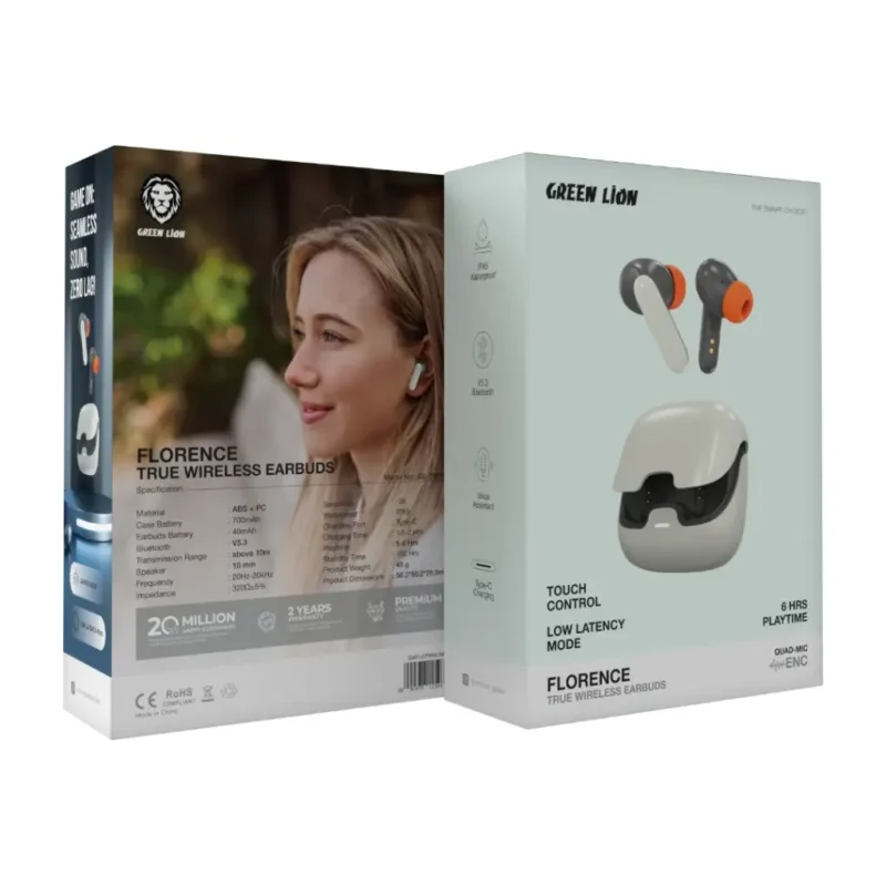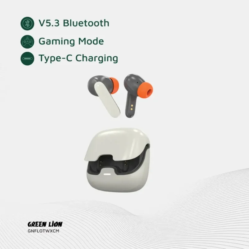 هندزفری Green Lion Florence TWS True Wireless Earbuds ترکیبی از طراحی شیک، کیفیت صدای بالا و امکانات پیشرفته است که برای استفاده روزمره، ورزش و حتی بازیهای موبایلی طراحی شده. این مدل با بلوتوث نسخه 5.3، مقاومت در برابر آب، حالت بازی و کنترل لمسی، تجربهای کامل از هندزفری بیسیم را ارائه میدهد.