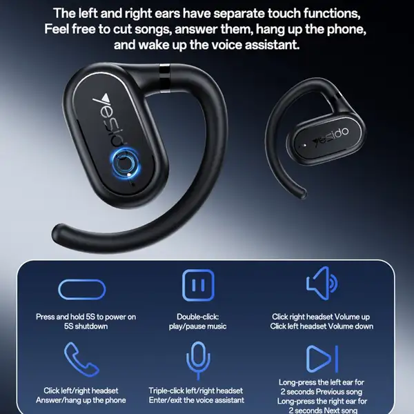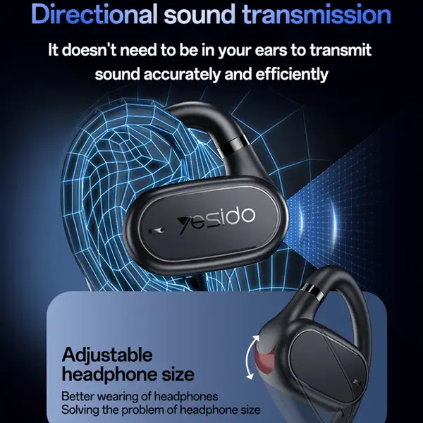 هندزفری یسیدو YESIDO YSP25 یک هدست بیسیم با طراحی Open Ear است که تجربه شنیداری راحت و طبیعی را بدون ورود مستقیم به مجرای گوش فراهم میکند. این مدل با قابلیت Bass Enhanced برای صدای قدرتمندتر، مقاومت در برابر آب و اتصال پایدار بلوتوث، گزینهای مناسب برای ورزشکاران، کاربران روزمره و علاقهمندان به موسیقی محسوب میشود.
