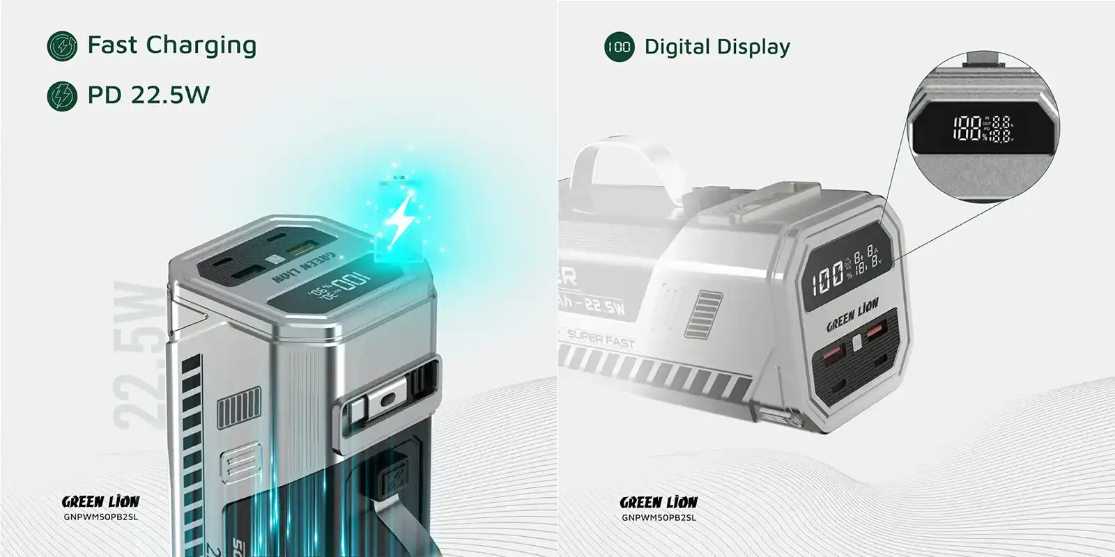 پاوربانک Green Lion Power Max 22.5W با ظرفیت 50000mAh یک انتخاب حرفهای برای کسانیه که به دنبال منبع انرژی قابل حمل، قدرتمند و ایمن هستن. این مدل با طراحی مقاوم، پورتهای متنوع، شارژ سریع و ظرفیت بالا، همراهی مطمئن برای سفر، کار و استفاده روزمره محسوب میشه.