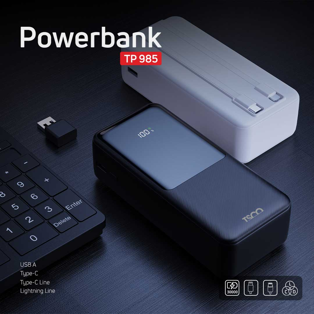 پاوربانک تسکو مدل TP 985: غول ۳۰۰۰۰ میلیآمپر ساعتی با شارژ سریع و کابلهای جداشدنی