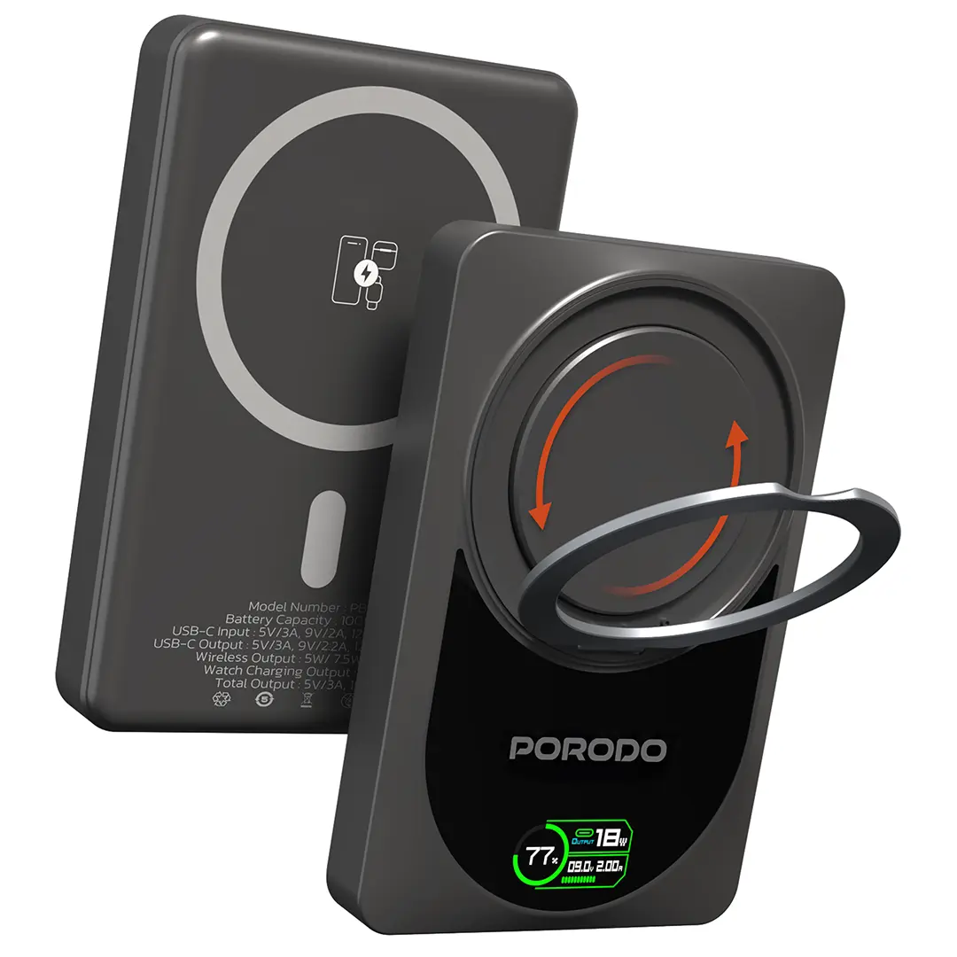 پاوربانک وایرلس فست شارژ Porodo PDPBFCH086DG با ظرفیت ۱۰٬۰۰۰mAh، فناوری Qi2، شارژ سریع بیسیم و باسیم، طراحی مغناطیسی و ایمنی بالا، انتخابی بینقص برای کسانیه که به دنبال یک منبع انرژی قابل حمل، شیک و قدرتمند هستن. اگر آیفون داری یا گوشی Qi2 دار استفاده میکنی، این مدل دقیقاً همون چیزیه که باید همیشه همراهت باشه.