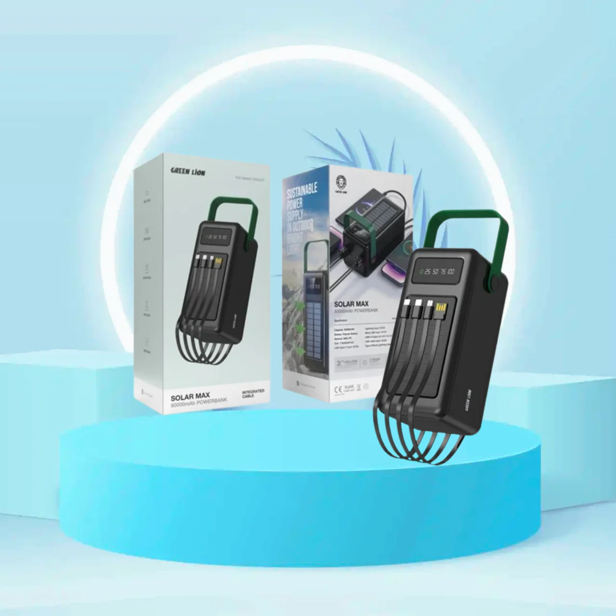 پاوربانک Green Lion Solar Max 80000mAh با ترکیب ظرفیت عظیم، پنل خورشیدی ۲۰W، شارژ سریع PD20W/QC3.0، نمایشگر دیجیتال و چراغ اضطراری، یک راهکار مطمئن برای سفر، کمپینگ و مواقع بحرانی است.