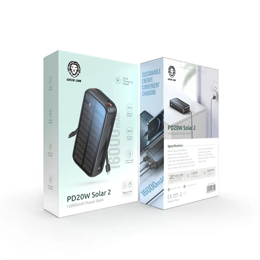 پاوربانک Green Lion Solar2 16000mAh با ظرفیت مناسب، پنل خورشیدی قدرتمند 20 وات، فناوری شارژ سریع و طراحی مقاوم، انتخابی عالی برای کسانی است که به دنبال یک پاوربانک مستقل، بادوام و کاربردی هستند. این محصول ترکیبی از فناوری، انرژی پاک و راحتی را در اختیار شما قرار میدهد و همراهی مطمئن در سفر، کمپینگ و زندگی روزمره خواهد بود.