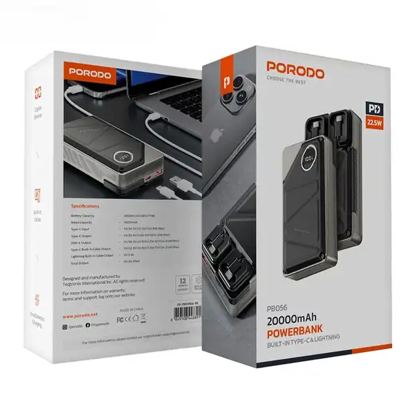 پاوربانک Porodo PD-PBFCH056 با ظرفیت 20000mAh، توان 22.5W و کابلهای داخلی Type‑C و Lightning، یک شارژر همراه قدرتمند و چندکاره است که با طراحی مقاوم و قابلیت شارژ سریع، انتخابی عالی برای کاربران آیفون و اندروید محسوب میشود. این محصول همراهی مطمئن برای سفر، کار و استفاده روزانه خواهد بود.