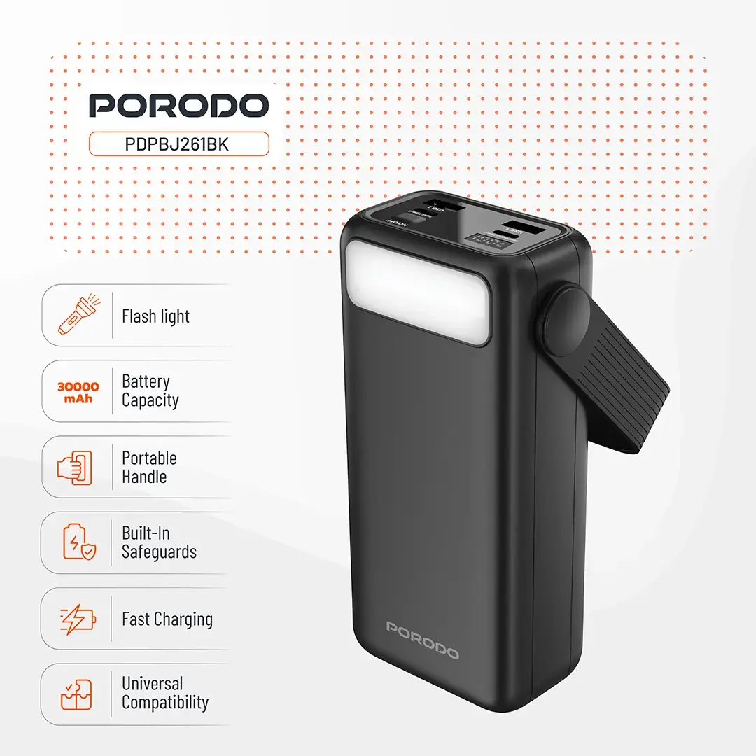 پاوربانک Porodo Lara 30000mAh 20W با ظرفیت بالا، توان خروجی ۲۰ وات و طراحی مقاوم، انتخابی کامل برای کسانی است که به دنبال یک پاوربانک قدرتمند، بادوام و کاربردی برای استفاده روزمره و سفر هستند.