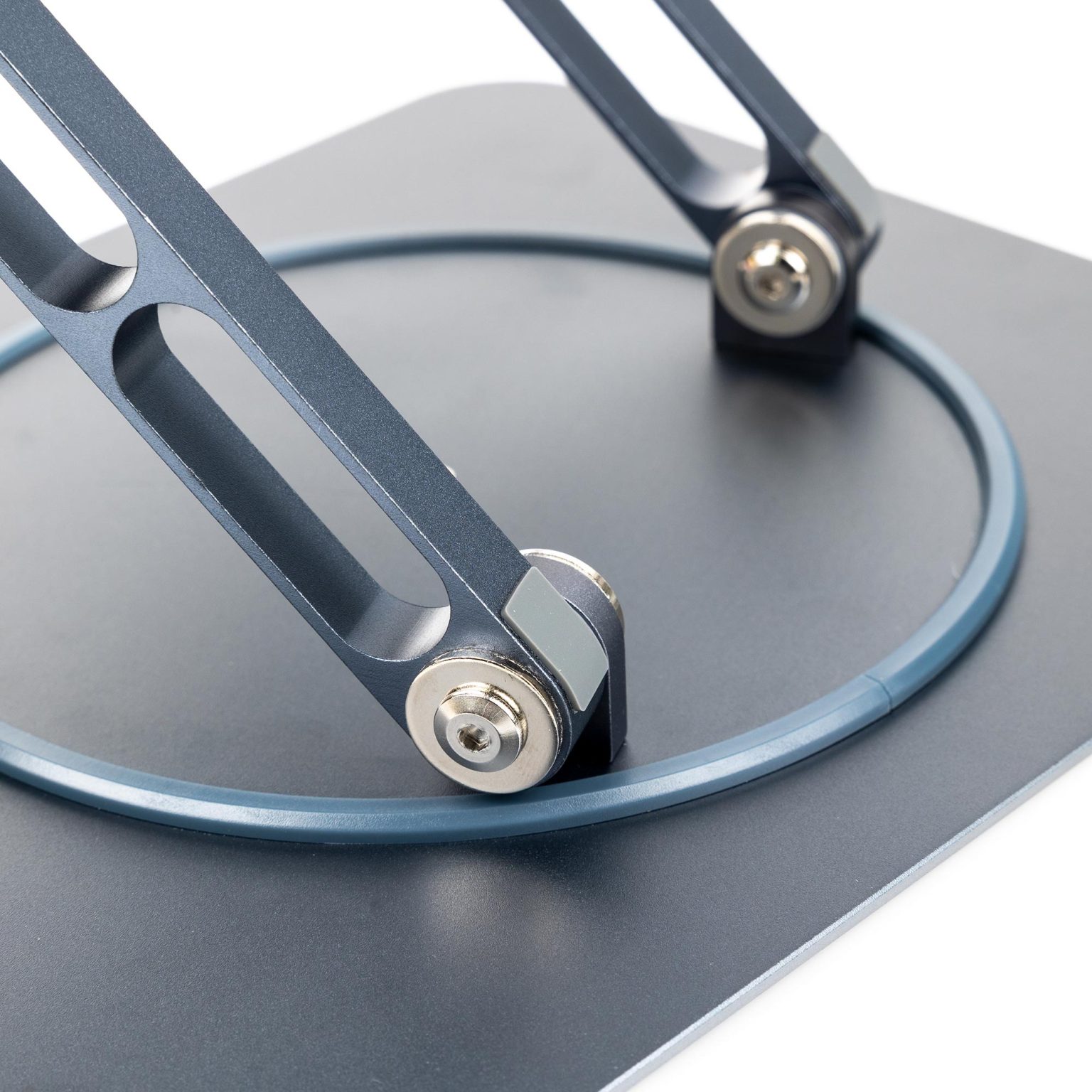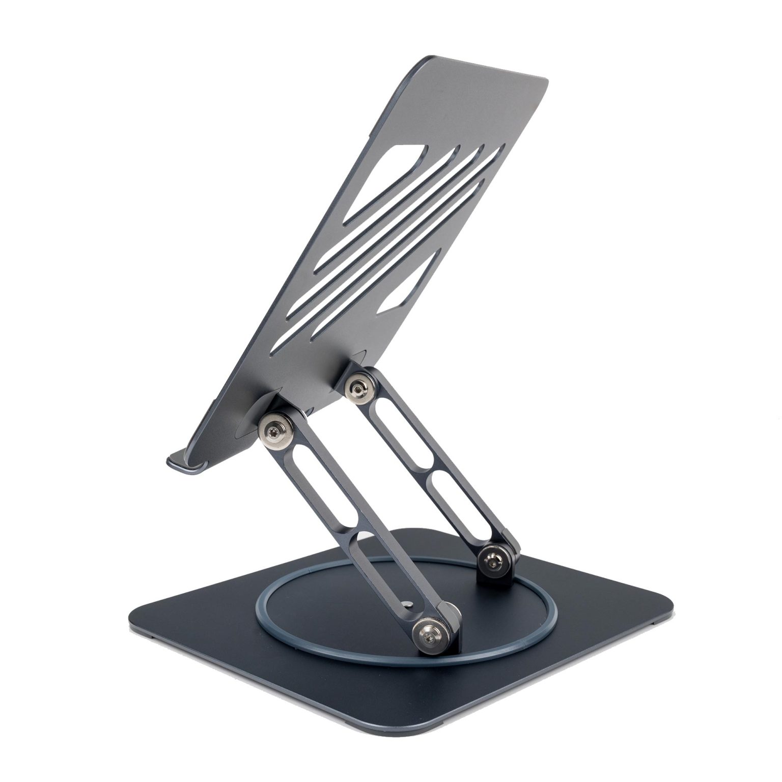 یکی از ویژگیهای کلیدی این پایه، قابلیت تنظیم ارتفاع و زاویه است که به کاربران اجازه میدهد تا لپتاپ یا تبلت خود را در بهترین موقعیت ارگونومیک قرار دهند و از خستگی گردن و کمر در استفادههای طولانیمدت جلوگیری کنند[2]. همچنین، قابلیت چرخش ۳۶۰ درجه این استند، انعطافپذیری فوقالعادهای را برای کاربریهای مختلف فراهم میکند؛ به راحتی میتوانید زاویه دید را تغییر دهید یا دستگاه را با دیگران به اشتراک بگذارید.