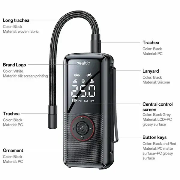 YESIDO VC17 یک پمپ باد چندمنظوره و قابلحمل است که برای باد کردن تایر خودرو، دوچرخه، موتور، توپهای ورزشی و وسایل بادی طراحی شده. این مدل با عملکرد کاملاً بیسیم، موتور قدرتمند، طراحی سبک و نمایشگر LED، تجربهای سریع، دقیق و راحت از باد کردن انواع وسایل را ارائه میدهد.