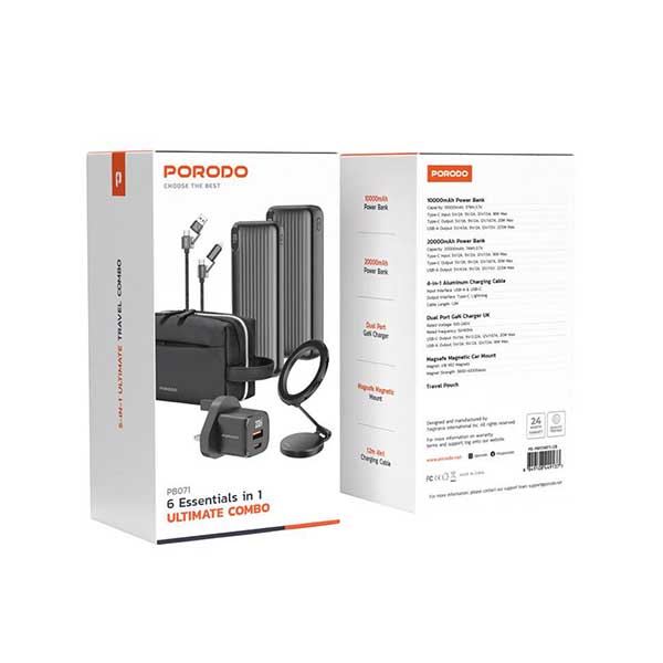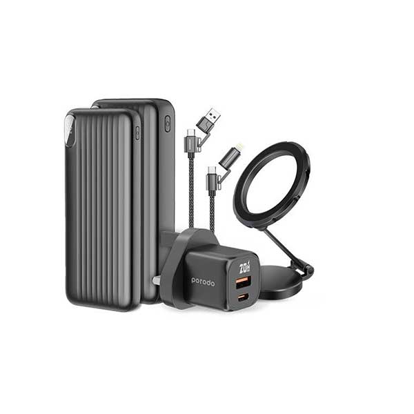 پک لوازم جانبی Porodo PB071 یک مجموعه کامل و چندمنظوره برای کاربران حرفه‌ای و پرتحرک است که شامل پاوربانک‌های قدرتمند، شارژر GaN، کابل شارژ چندکاره، پایه مغناطیسی خودرو و کیف مسافرتی می‌شود. این مجموعه با طراحی مهندسی‌شده، کیفیت ساخت بالا و قابلیت‌های شارژ سریع، انتخابی هوشمندانه برای سفر، محل کار و استفاده روزمره محسوب می‌شود.