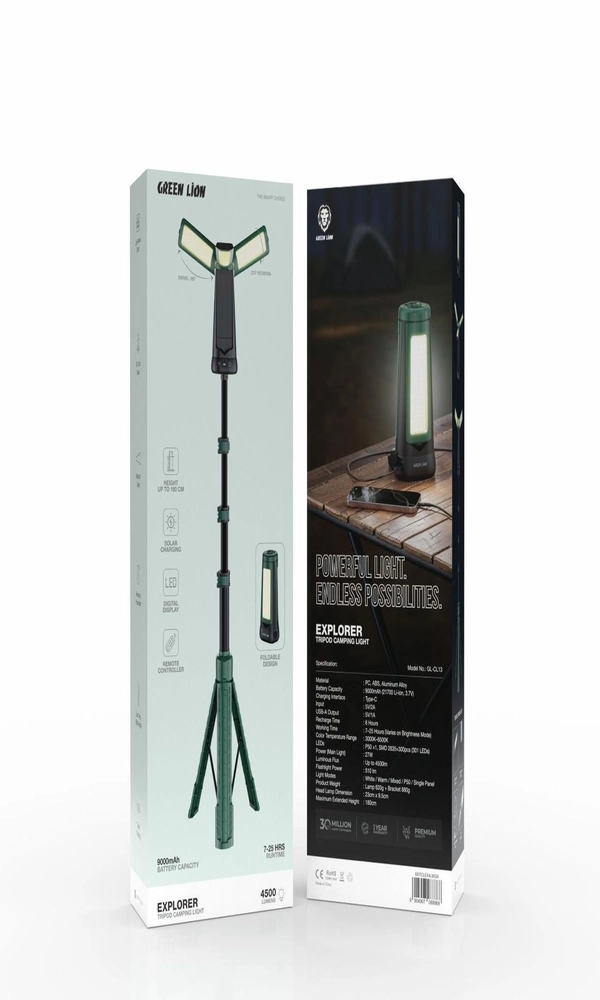 چراغ کمپینگ Green Lion Explorer Tripod Camping Light یک منبع نور قدرتمند و قابل‌حمل برای سفرهای طبیعت‌گردی، کمپینگ و استفاده در فضای باز است. این مدل با پایه سه‌پایه‌ای و ارتفاع 180 سانتی‌متر طراحی شده تا نور را در سطح وسیع‌تری پخش کند و محیط اطراف را به‌طور کامل روشن نماید.