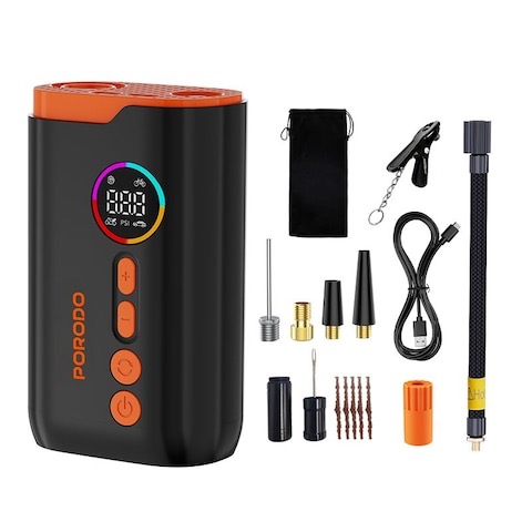 کمپرسور باد Porodo Lifestyle Air Inflator با فشار بالا، باتری قابل شارژ، نمایشگر دیجیتال و چراغ اضطراری، یک ابزار کامل و قابل حمل برای بادگیری سریع و ایمن در شرایط مختلف است. این محصول با طراحی مقاوم و عملکرد پایدار، همراهی مطمئن برای خودرو، سفر و فعالیتهای روزمره خواهد بود.