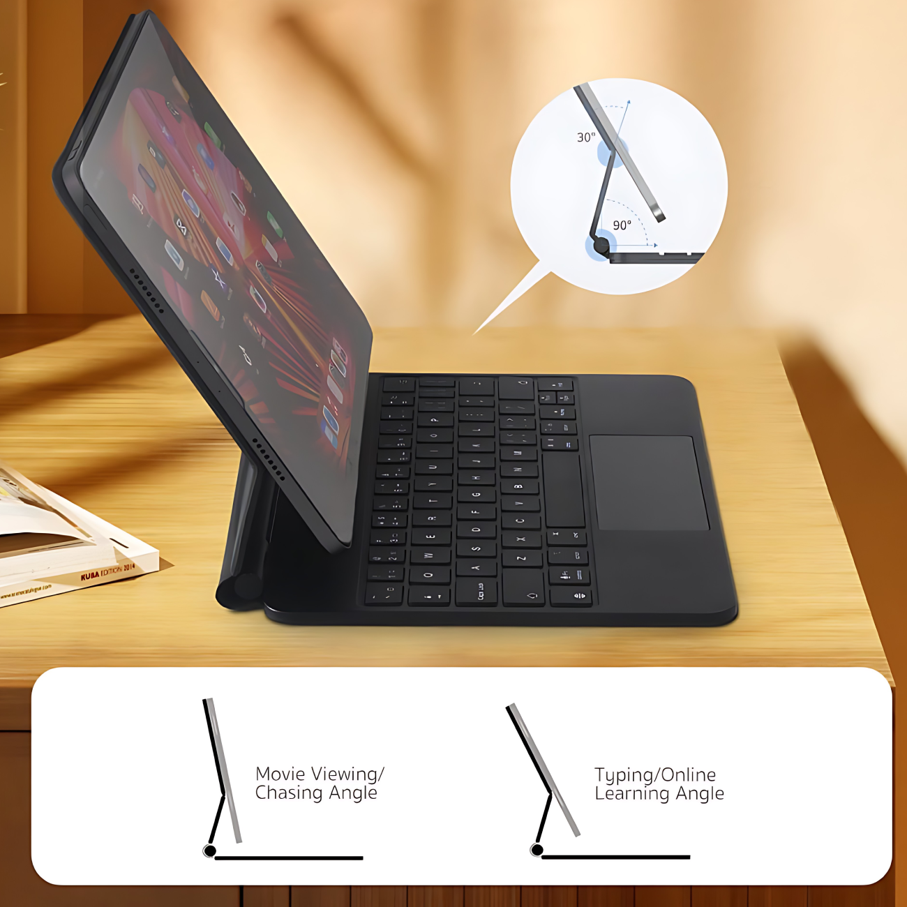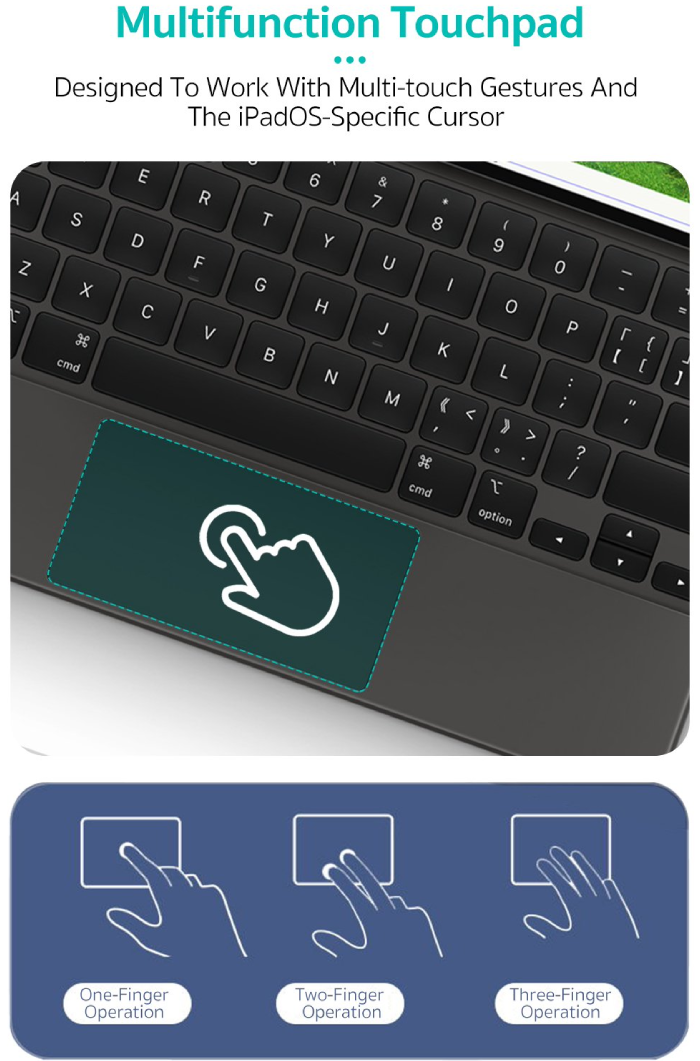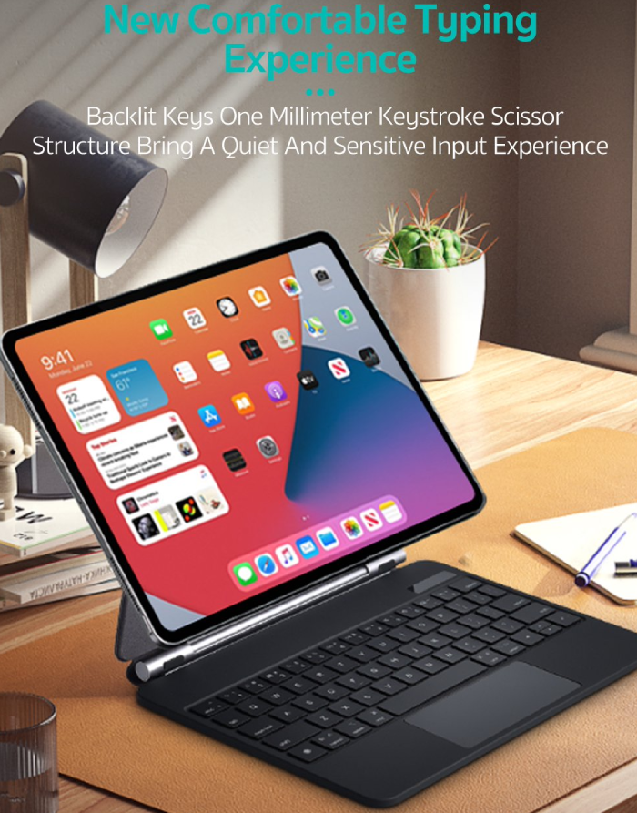 این کیس مجهز به یک تاچ‌پد یکپارچه است که ناوبری در آیپد را بسیار راحت‌تر کرده و به شما امکان می‌دهد با حرکات چندلمسی، کنترل دقیق‌تری داشته باشید. کیبورد آن دارای نور پس‌زمینه است که کار در محیط‌های کم‌نور را آسان می‌کند. یکی از ویژگی‌های کاربردی این مدل، نمایشگر دیجیتال روی کیبورد است که به شما امکان می‌دهد درصد شارژ باتری را به صورت دقیق مشاهده کنید.